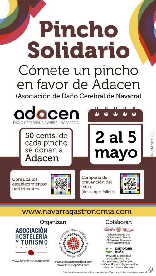 La Asociación de Empresarios de Hostelería y Turismo de Navarra y la Federación de Peñas de Pamplona y el Ayuntamiento de Pamplona colaboran con la Adacen (Asociación Daño Cerebral de Navarra) en una iniciativa solidaria: el «Pincho Solidario».