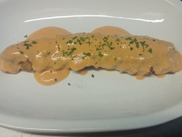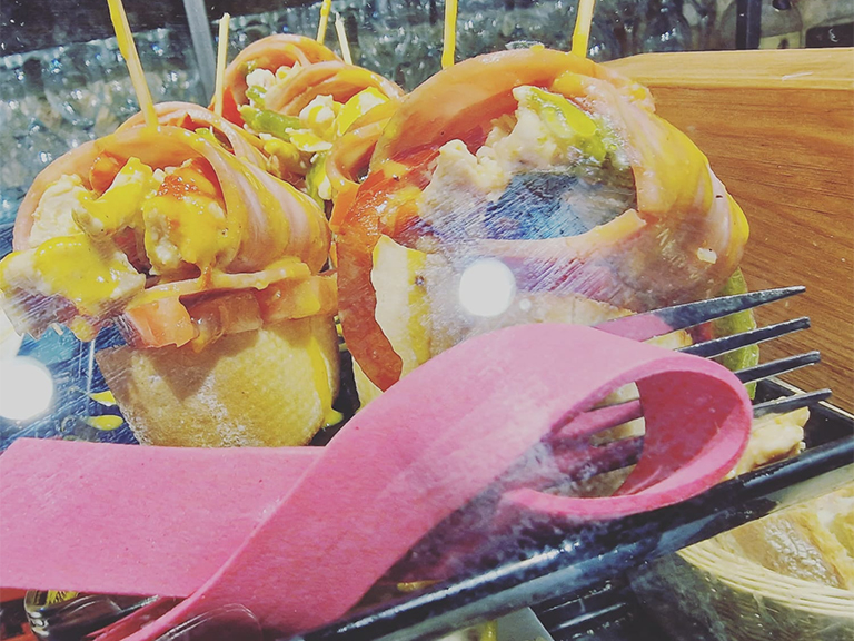 Bacon relleno de pollo y Pimientos con salsa de mostaza y miel