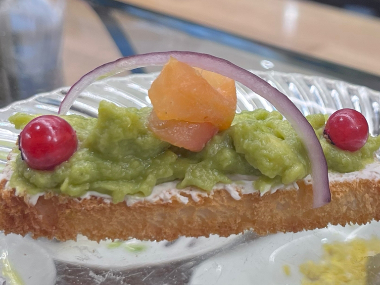 Tostada con guacamole, crema de queso, salmón ahumado, grosellas y cebolla roja