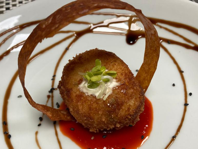 Croqueta líquida de queso brie con coulis de frutos del bosque