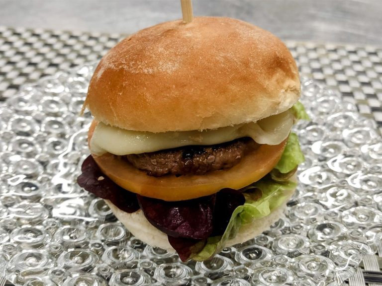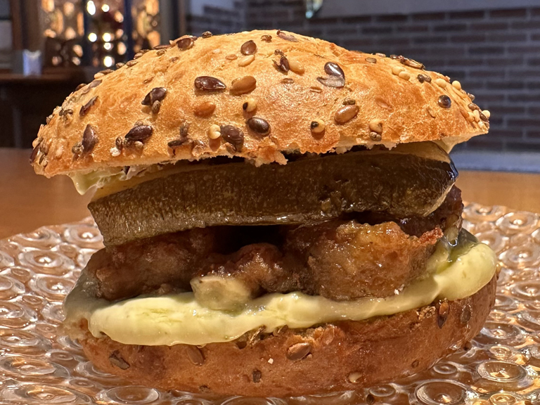 Mini bocadillo (en pan de semillas) de costilla, crema de calabacín y pesto.